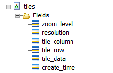 Include the values and tile id which are used to locate. Except the four fields in MBTiles1.1: zoom_level, tile_colum, tile_row and tile_id, it adds the resolution field. Support any scales or resolution. create_time field identifies the time of creating tile. If the tile is the pure color, tile_id is composed of the hexadecimal values of image RGB. For example, the red image tile_id is "ff0000". Others' tile_id is the cluster of resolution_x_y.
