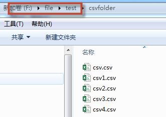 如果注册的是带有csv文件的文件目录,则需填写csv文件所在的目录的上一级目录。以下图为例,填写的路径为F:\file\test,其中,csv文件的字段、属性等格式必须相同。(仅支持已只读的方式打开csv文件目录)